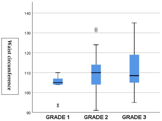 Association between MASLD grades and waist circumference. Higher grades of steatosis were associated with increased waist circumference, reflecting greater central obesity.
