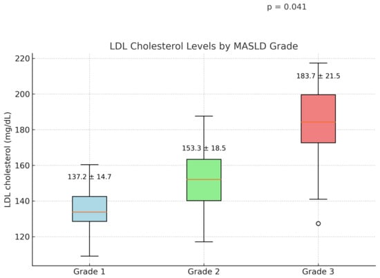LDL cholesterol levels increased progressively with the severity of MASLD. The mean LDL levels were 137.2 ± 14.7 mg/dL in grade 1, 153.3 ± 18.5 mg/dL in grade 2, and 183.7 ± 21.5 mg/dL in grade 3 (p = 0.041) (Figure 2).
