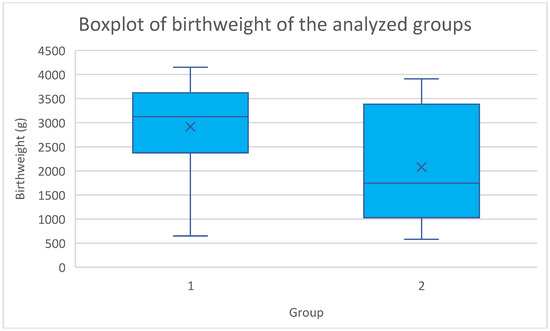 A boxplot illustrating the distribution of birthweight across the elective and emergency cerclage groups. 1—elective cerclage group; 2—emergency cerclage group.