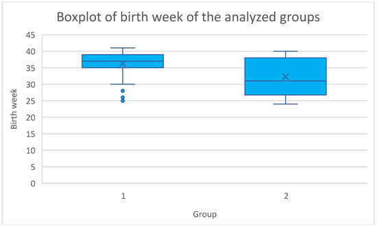 A boxplot illustrating the distribution of the birth week across the elective and emergency cerclage groups. 1—elective cerclage group; 2—emergency cerclage group.