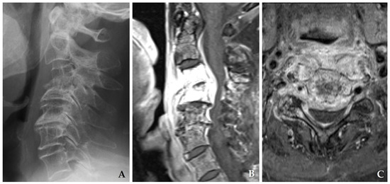 Plain radiograph (A) and magnetic resonance imaging (B,C) demonstrate destructive changes in the C3–C4 vertebral bodies with kyphotic deformity accompanied by retropharyngeal and epidural abscesses compressing the spinal cord.