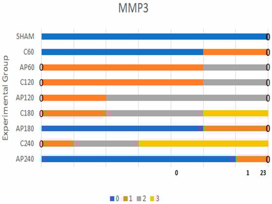 Based on the results for MMP-3 expression (Figure 1), weak statistical significance was observed in the comparisons between sham vs. C60 and C60 vs. Ap60. In contrast, the comparisons between C120 vs. Ap120 (Figure 2a,b), C180 vs. Ap180 (Figure 2c,d), and C240 vs. Ap240 (Figure 2e,f) demonstrated strong statistical significance, indicating a pronounced reduction in MMP-3 expression following apigenin treatment.