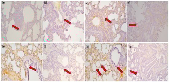 Photomicrographs of MMP-3 expression in lung tissue of the control and apigenin groups at 120 min (a,b), 180 min (c,d), and 240 min (e,f) and MCP-1 expression at 180 min (g,h) (magnification ×200). Arrows indicate areas of positive immunohistochemical staining.