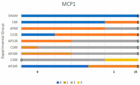MMP-3 and MCP-1 expression levels in the sham group were minimal and not statistically significant when compared to the control group. For MMP-3, the highest statistically significant differences were found in the comparisons between C120 vs. Ap120, C180 vs. Ap180, and C240 vs. Ap240. Similarly, for MCP-1, the comparison between C180 and Ap180 yielded the strongest statistical significance. All findings were derived using Bayes factor analysis (Table 1 and Table 2) [25].