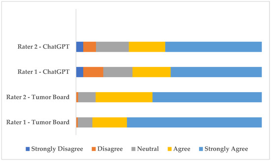 The distribution of rater scores is visualized in Figure 1. As shown in Figure 1, agree and strongly agree evaluations were predominant for both raters across tumor board and AI decisions. However, AI decisions received fewer “Agree” and “Strongly Agree” ratings and more “Strongly Disagree and Disagree” ratings compared to tumor board decisions, highlighting a relatively lower level of endorsement by the raters.