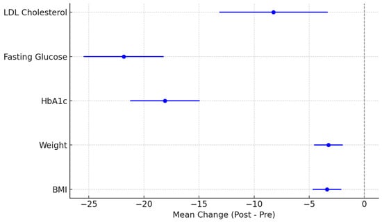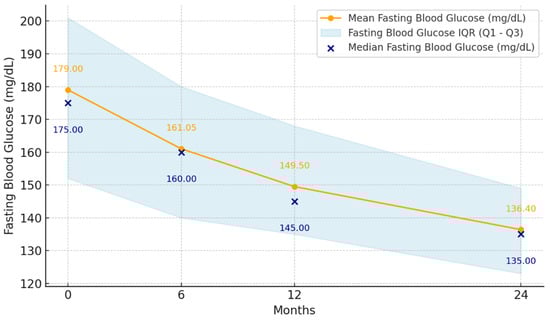 | FPG 12 months vs. 24 months | Wilcoxon | Z = −4.974 | p < 0.001 | Continued improvement in fasting glucose |