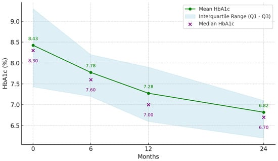 | HbA1c 12 months vs. 24 months | Wilcoxon | Z = −5.108 | p < 0.001 | Sustained improvement in HbA1c |