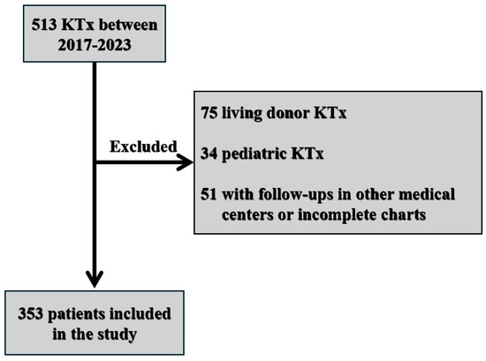 Between January 2017 and September 2023, 513 kidney transplants were performed at the Clinical Institute of Urology and Renal Transplantation Cluj-Napoca. After applying the exclusion criteria, 353 transplants were included in this study. The flow chart of patients included in this study is shown in Figure 1.