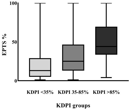 When we analyzed the distribution of the EPTS in the three KDPI groups, we found statistically significant differences, with a higher EPTS % with increasing KDPI scores (p < 0.01, Kruskal–Wallis test), as shown in Figure 3.