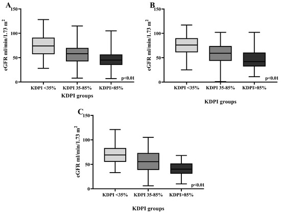 eGFR at one (A), three (B), and five years (C) in the three KDPI groups.