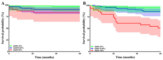 Graft (A) and patient (B) survival in the three KDPI groups.