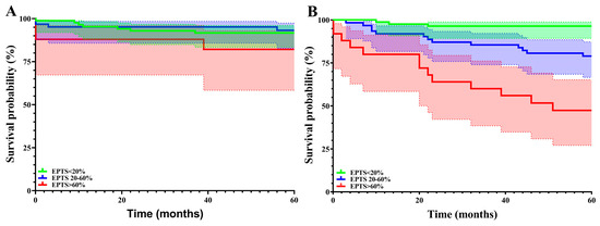 Graft (A) and patient (B) survival rates according to the EPTS score.