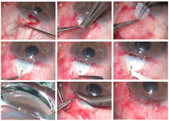 Surgical technique for the 30G needle-mediated open-conjunctiva ab externo XEN® 45 and 63 µm implants. (A) Instillation of sub-Tenon’s anesthetic (2% lidocaine with epinephrine) after initial peritomy with Vanna’s scissors. (B) Dissection of conjunctiva and the Tenon’s capsule with Wescott scissors. (C) Application of MMC 0.02% on the scleral bed. (D) Marking at 2 mm from the surgical limbus and creation of the scleral tract with a 30G needle. (E) Manual insertion of the XEN® implant using non-toothed forceps. (F) Verification of correct tubular filtration at the distal segment of the XEN. (G) Verification of the correct implantation of the device with a gonioscopy lens. (H) Tenon’s capsule closure with interrupted Vicryl 7.0 sutures. (I) Closure of the conjunctiva with interrupted 10.0 Nylon sutures.