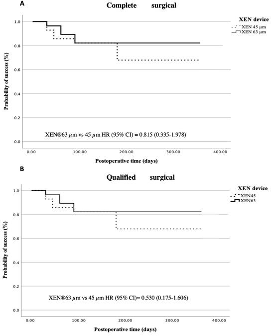 The Kaplan–Meier survival curves for complete and qualified surgical success, adjusted for baseline IOP and the use of bleb space modulators, are presented in Figure 2A,B). Complete surgical success was achieved in 17 cases (60.7%) in the 45 µm group and in 20 cases (71.4%) in the 63 µm group. Additionally, qualified surgical success was accomplished in 19 eyes (67.9%) in the AEO XEN® 45 µm group and in 23 eyes (82.1%) in the XEN® 63 µm group. For multivariable Cox regression, both complete (HR (95% CI) = 0.815 (0.335–1.978)) and qualified (HR (95% CI) = 0.530 (0.175–1.606)) survival failure rates were lower in the XEN® 63 µm device, with no statistical significance.