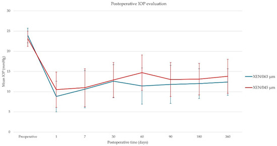 Postoperative mean IOP evolution in the XEN® 45 µm and the XEN® 63 µm. The error bars indicate standard deviations.