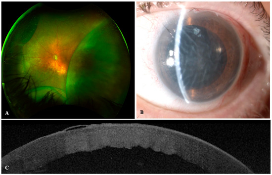Intraoperative complications included two cases of self-limited hyphema in both groups and a case of aqueous misdirection syndrome resolving with intravenous mannitol. Postoperative complications included one case of wound leak in the 45 µm device, treated with a contact lens. A dysesthetic bleb with secondary Dellen in the 63 µm group was noted, which underwent surgical revision, achieving a favorable postoperative outcome. A case of anterior segment syndrome (TASS), with IOP spike, Urretz–Zavalia syndrome, and corneal decompensation was reported in the 45 µm group. Eventually, the patient required Descemet stripping automated endothelial keratoplasty (DSAEK) and TBT, due to poor IOP control (Figure 4).