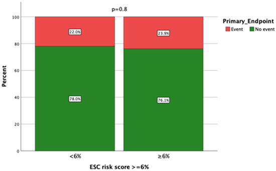 As represented in Table 1, patients who encountered a primary outcome event had greater LA diameters and a more frequently depressed LVEF compared to patients without events. Moreover, severe myocardial fibrosis on CMR was encountered more frequently in patients with primary outcome events (60%) compared to patients without events (36.1%), p = 0.04. The mean HCM Risk Score was not significantly different between those with and those without a primary outcome event (Table 1). The primary outcome was also not significantly different between patients with HCM Risk Scores ≥ 4% compared to those with a score <4% (p = 0.56). The same applied to a score of >6% (Figure 1). However, most patients (88 out of 108; 81.5%) had an ESC risk score of ≥ 4%, and for those with a low score <4%, the majority (17/20) experienced no primary outcome events over the follow-up period. Correspondingly, the positive predictive value was as low as 25%, but the negative predictive value was rather high at 85%.