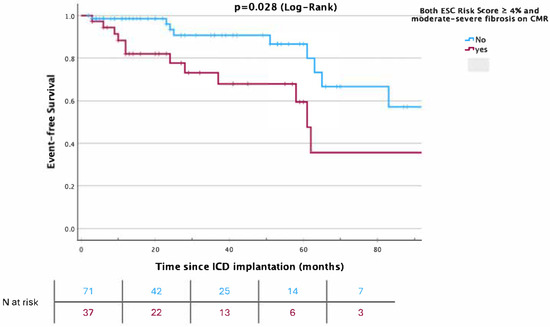 Moreover, the HCM Risk Score did not differentiate patients with (7.95 ± 5.0%) vs. without (7.81 ± 4.1%) appropriate ICD treatments (p = 0.89), nor were survivors (8.6 ± 4.6%) separated from non-survivors (7.8 ± 4.2%, p = 0.61). For multivariable Cox regression analysis (Table 3), the ESC risk score was not a significant predictor of primary outcomes (p = 0.08). The finding of severe fibrosis on CMR was significant only in univariate analysis but not in multivariate analysis. Significant predictors of primary outcomes included age, the LA diameter, and maximal LV wall thickness, as represented in Table 3.