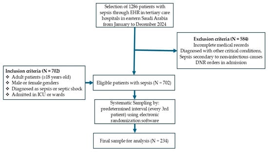 In this retrospective study, the sample size was determined using the formula (n = (Z2 × p × (1 − p))/d2) to be approximately 207, with a margin of error of 5%, a confidence level of 95%, and an estimated prevalence of sepsis in the target population of around 16%, based on the results of a previous study [9]. To enhance the study’s statistical power and account for missing data, a total of 234 patients were selected, as illustrated in Figure 1. A systematic sampling technique was applied to select eligible patients from the selected hospital records. The procedure involved the following stages: extracting a list of all sepsis patients from the hospital database meeting the inclusion criteria, assigning a unique identifier to each patient, using a systematic selection method to choose 234 patients from the total eligible population, and ensuring an unbiased selection process by using predetermined intervals.