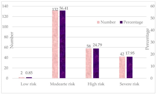 As per the SOFA score, the risk classifications of sepsis patients are depicted in Figure 2. Only two patients (0.85%) fell into the low-risk category, indicating minimal organ dysfunction and a low likelihood of adverse outcomes. Most of the patients, 132 (56.41%), were classified as having a moderate risk, suggesting some degree of organ dysfunction but a relatively favorable prognosis. Around 58 patients (24.79%) were classified as high risk, indicating significant organ dysfunction and an increased probability of severe complications or mortality. Approximately 42 patients (17.95%) fell into the severe risk category, reflecting critical organ failure and a high mortality risk.