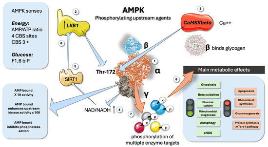 - Hardie, D.G. AMP-Activated Protein Kinase—A Journey from 1 to 100 Downstream Targets. Biochem. J. 2022, 479, 2327–2343. [Google Scholar] [CrossRef]