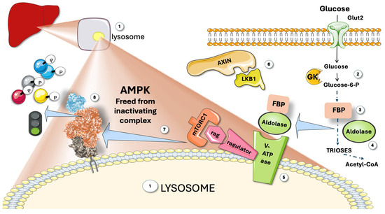 As shown in Figure 2, aldolase, in addition to being a glycolytic enzyme, is a glucose availability sensor that controls AMPK. An AXIN-based AMPK-activation complex forms when aldolase is free of its substrate fructose-1,6-bisphosphate (FBP), whose levels sharply drop when glucose flux is low. When glucose is high, as shown in the figure, aldolase detects and binds the glycolytic intermediate fructose-1,6-bisphosphate (FBP) and attaches itself to the lysosomal surface’s v-ATPase [11,15,16,43,44]. Increased Thr172 phosphorylation and AMPK activation result from the changed interactions between aldolase and the v-ATPase in the absence of FBP. This allows the creation of an AXIN-based AMPK-activation complex that includes the v-ATPase, Ragulator, AXIN, LKB1, and AMPK (Figure 2). In addition to activating AMPK, this nutrient-sensing mechanism sets it up for future activation if the cellular energy status declines [18,20,45].