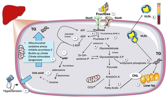 Most of the absorbed fructose enters the circulation through the basolateral membrane of enterocytes thanks to the associated GLUT2 transporter (reviewed in [29]). The intestines thus function as a barrier and may convert fructose into glucose or lactate when small amounts of sugar are eaten, as in fruit. The portal system then carries the glucose or lactate to the liver. Conversely, numerous adverse effects can arise when fructose consumption is significantly higher, as it is in many American teenagers (where it may account for up to 25% of caloric intake). The microbiota metabolizes excess fructose to create acetate, which is then sent to the liver through the portal system and participates—together with fructose itself—in the development of hepatic IR, as we shall discuss later (reviewed in [29]). Moreover, because fructose encourages the growth of undesirable microbiota, it causes leaky gut, which has detrimental inflammatory effects and lets dangerous substances enter the liver. DNL is the metabolic pathway by which fatty acids are synthesized from non-lipid precursors [49,53,54,55]. The accumulation of TG in the liver has several downstream effects that are detrimental to metabolic health. One of the primary outcomes is the development of MASLD, characterized by excessive fat buildup in liver cells. MASLD can progress to more severe forms of liver disease, including non-alcoholic steatohepatitis (NASH), fibrosis, and cirrhosis. Increased hepatic TG also contributes to hepatic insulin resistance [56,57,58,59,60,61,62,63,64,65,66]. Hepatic insulin resistance can then alter the production and secretion of lipoproteins, leading to an unfavorable lipid profile. Elevated levels of very-low-density lipoproteins (VLDL) and small-dense low-density lipoproteins (sd-LDL), coupled with decreased high-density lipoproteins (HDL), are common in individuals with MetS and MASLD. This dyslipidemia is a major risk factor for cardiovascular diseases [22,67].