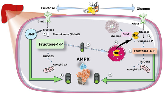 Regarding fructose, most of its metabolism occurs in the liver and begins with uncontrolled phosphorylation, which is followed by a decrease in ATP and a rise in AMP levels [25,26,27,28,29,30,31]. AMPK activation should ensue in those circumstances, decreasing lipid synthesis, boosting lipid oxidation, and decreasing glucose output.