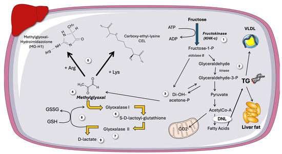 Indeed, fructose increases both de novo lipogenesis and glycation [27,32]. The former causes hepatic fat storage and dyslipidemia, and the latter induces carbonyl stress. Indeed, trioses from either glycolysis or fructolysis serve both as precursors of TG and methylglyoxal (MG), the most lethal glycating agent known, which, when elevated, replicates the metabolic syndrome phenotype in animal models [33,34,35].