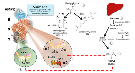 Figure 6 illustrates a possible outcome of abrupt increases in MG brought on by the metabolism of fructose in the liver. We propose that MG may form adducts with critical arginine residues in both the CBS (AMP-sensing sites) and critical lysine residues in the ADaM site, leading to sudden (obviously transient) and potentially synergic “blinding” of AMPK.