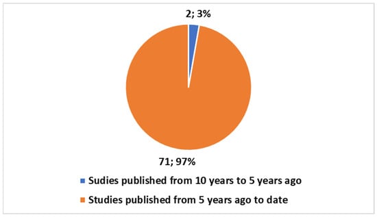 Figure 1 illustrates the number of publications on DTs in oncology within the last five years and between the last ten and five years. The data for this chart was extracted and plotted using Excel, with two categories: publications from the last five years and those from the period between five to ten years ago. The publication numbers for each category were visually represented using a pie chart, with percentages calculated based on the total count of 73 studies.