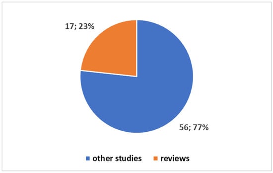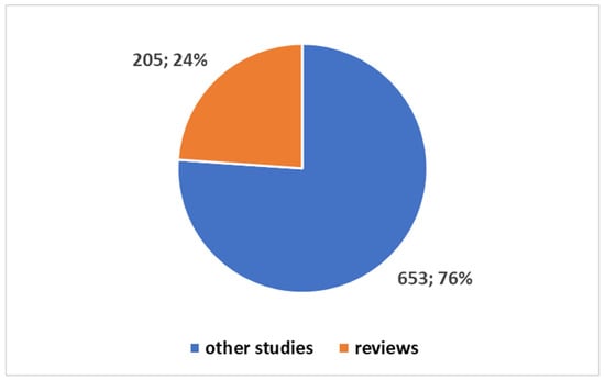 Figure 4 illustrates the distribution between review articles and other primary studies in the health domain. This pie chart was also created in Excel and highlights the proportion of reviews within the health domain (23.91%) compared to primary studies (76.09%).