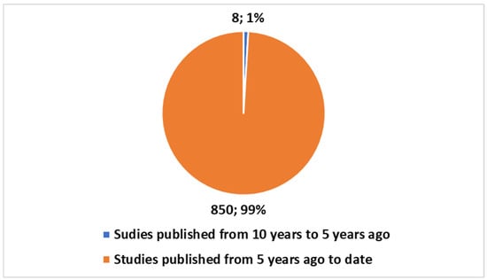 When comparing the total publications on DTs in the health domain using the second search term from Box 1, we find 858 publications since 2016, which means all have been produced in the last 10 years. Out of these, 850 publications (representing 98.6%) were published in the last five years (Figure 3). Additionally, a total of 205 (or 23.91%) are reviews (Figure 4). Both figures were generated in Excel using the same methodology as in Figure 1 and Figure 2. The bar chart in Figure 3 shows the same two time categories (last five years and five to ten years ago) for the entire health domain dataset, with numbers and percentages visually represented. Figure 4, similarly, displays the distribution of review articles (205) and primary studies (653) within the broader health domain using a pie chart format.