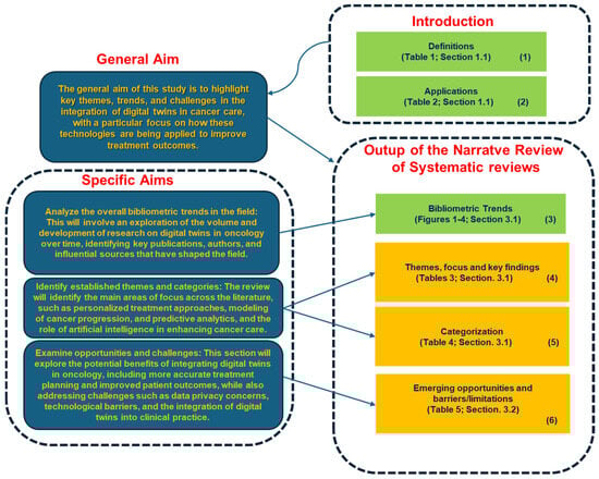 The general aim of this study is to highlight key themes, trends, and challenges in the integration of digital twins in cancer care, with a particular focus on how these technologies are being applied to improve treatment outcomes. Specifically, the objectives of this study are as follows: