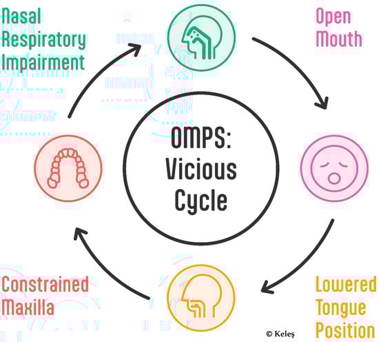 The vicious cycle of OMPS: Nasal respiratory impairment (green) leads to oral breathing and, thus, an open mouth (pink). This in turn leads to a lowered tongue position (orange), and the absence of a stimulus on the maxilla constrains the jaw (red), which completes the cycle by impairing nasal respiration.