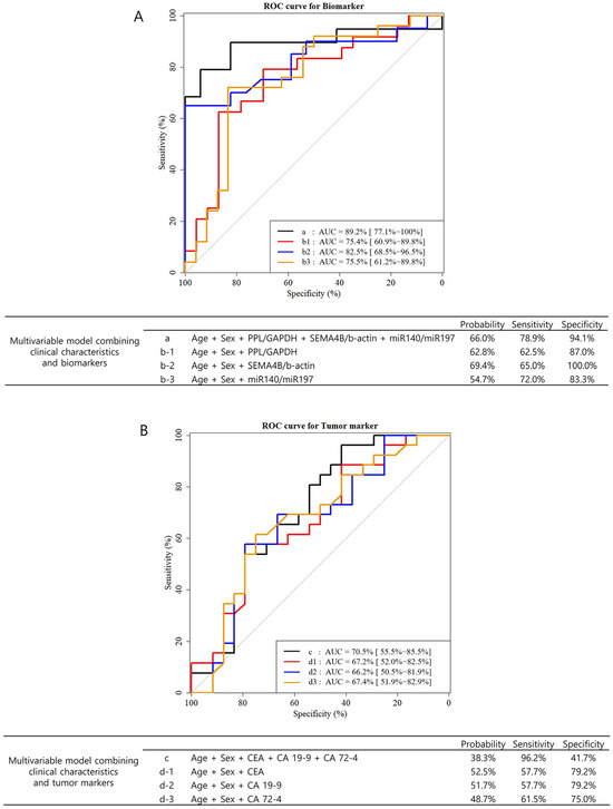 The receiver operator characteristic (ROC) curves and area under the curve (AUC) of multivariable models of pre-operative biomarkers and tumor markers in predicting tumor burden (stages III and IV). A multivariable model was analyzed using logistic regression. In this model, Firth’s penalized likelihood approach was applied because of the small sample size. (A) The ROC curves of multivariable models combining clinical characteristics (age and sex) and three biomarkers (PPL, SEMA4B, and miR140-5p). (B) The ROC curves of multivariable models combining clinical characteristics (age and sex) and three conventional tumor markers (CEA, CA19-9, CA72-4).