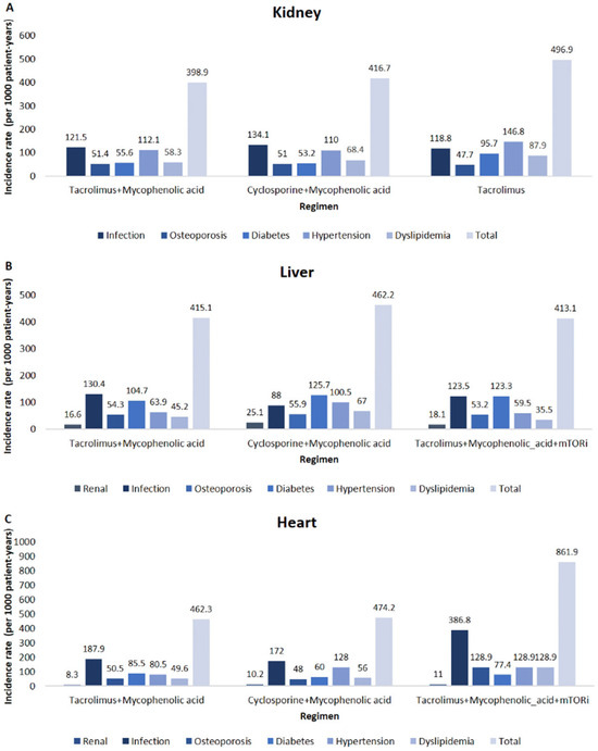 3.2. Incidence Rate of Immunosuppressant-Related Complications by Organ Types