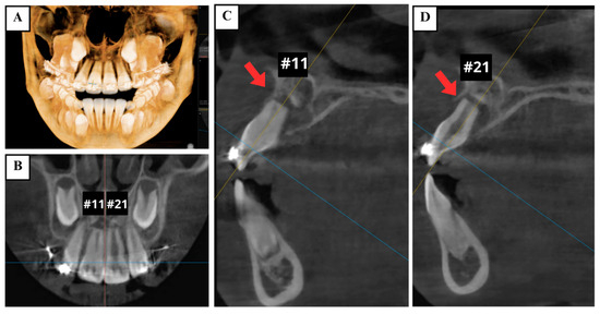 CBCT images at 14 months after orthodontic treatment showing satisfactory periodontal tissues around both the fractured fragments and the apical area (arrows). (A) 3D reconstruction. (B) Coronal view. Sagittal views of the (C) right maxillary central incisor (tooth #11) and (D) left maxillary central incisor (tooth #21).