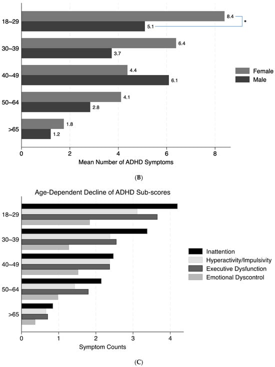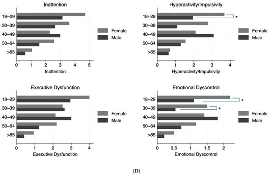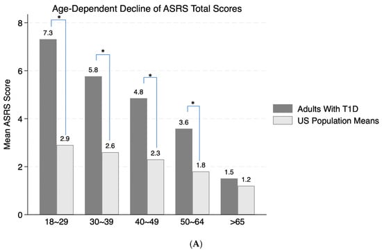 There was a significant age-dependent decline of the ASRS-reported ADHD symptoms (χ2(1) = 55.0, p < 0.0001; Figure 1A). Compared to normative data from 22,397 adults in the US population [], as shown in Figure 1A, adults with T1D reported significantly higher symptom scores than those reported in the normative sample. For all age strata except those > 65 years, the normative population values were below the lower bound of the 95% confidence intervals of ADHD total symptom scores in our adults with T1D (indicated by * in Figure 1A). Overall, women reported significantly higher symptom counts than men (χ2(1) = 4.4, p = 0.04), particularly in the younger groups (ages 18–29, highlighted by * in Figure 1B). The proportions of men and women across different age strata were similar (χ2(4) = 7.7, p = 0.1), with more women than men across all age strata. There was no significant interaction between age and sex on the total symptom scores. All ADHD sub-scores also demonstrated significant age-dependent decline (Figure 1C), with consistently higher symptom counts for women than men overall. However, only women in the younger age group reported significantly higher symptom counts for hyperactivity/impulsivity and emotional dyscontrol (indicated by * in Figure 1D). Nevertheless, all subgroup comparisons were not significant after Bonferroni corrections.
