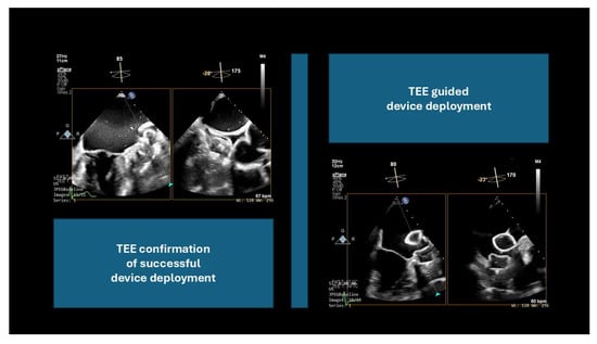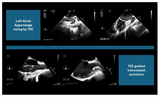 - Burysz, M.; Batko, J.; Malec-Litwinowicz, M.H.; Kowalewski, M.; Litwinowicz, R.A.; Burysz, A.; Graczykowski, Ł.; Olejek, W. Combining echocardiography and fluoroscopy imaging in real time for left atrial appendage occlusion—Single center experience from Poland. Kardiochir. Torakochir. Pol. 2024, 21, 30–34. [Google Scholar] [CrossRef] [PubMed] [PubMed Central]