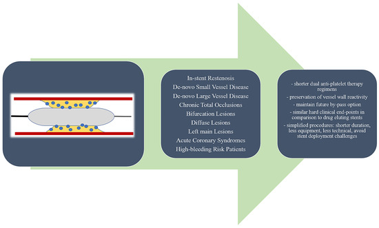 Drug-coated balloons (DCBs) have become a valid alternative to drug-eluting stents (DESs) for the treatment of in-stent restenosis (ISR) and de novo lesions in small vessel disease. Although initially it was considered that the key to obtaining a good result after a DCB percutaneous coronary intervention (PCI) was the selection of patients and lesions, later on it became obvious that the more complex the lesion is, the more beneficial the limitation of metallic prosthetics implantation is. As a result, in recent years, multiple trials and registries have reported promising results for their use in more complex settings as well, such as large vessel de novo lesions, bifurcations (including left main lesions), acute coronary syndromes, diabetic patients with multivessel disease, or high bleeding patients [1]. As calcific lesions, long stents, stent malapposition/underexpansion, and premature dual antiplatelet therapy (DAPT) discontinuation have been identified as predictors of stent failure [2,3], the use of a DCB in such cases appears well reasoned. The purpose of the present paper is to review the most recent data on the use of DCBs in complex lesions and patients, as it is our strong belief that DCBs might have the potential to become a first-line armamentarium in treating complex lesions, with bailout stenting in case of suboptimal results. Figure 1 summarizes the complex settings in which DCBs have been tested with promising results.