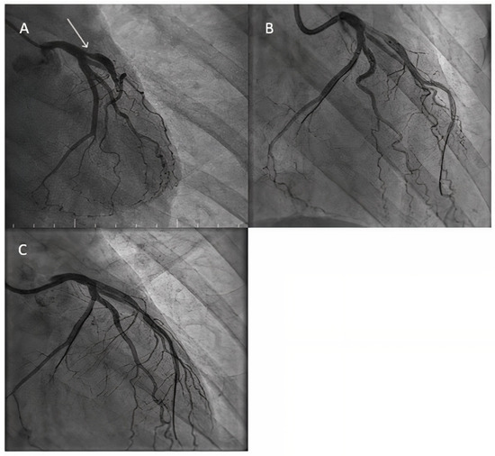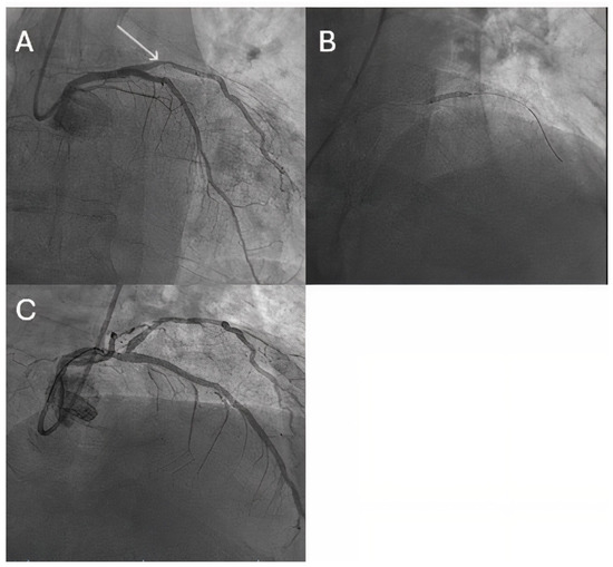 Ostial LAD stenosis treated by an LM-LAD DCB approach. (A) Angiographic aspect of a severe ostial LAD stenosis. (B) The aspect of the vessel after predilatation. (C) Final angiographic result.