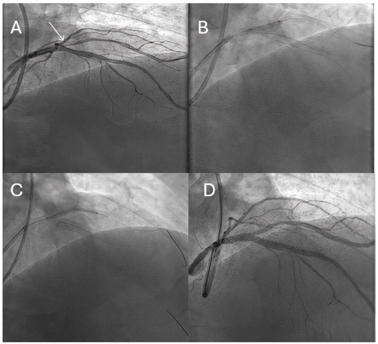 DCB role in large coronary arteries. (A) Diagnostic angiography revealing an ostial lesion of a 3.2 mm diagonal (white arrow). (B) Predilatation using a scoring balloon of 3.0 mm. (C) DCB inflation in the diagonal branch. (D) Good final angiographic result.