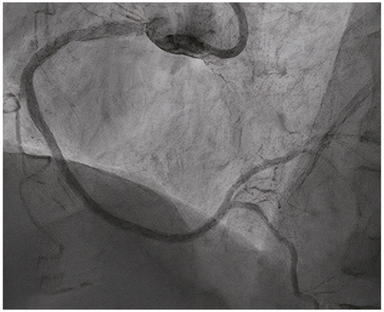 These results are, however, contradictory to several randomized clinical trials, which showed similar 12-month MACE rates between DCB and DES in large artery disease [26], as well as low two-year follow-up TLF, TLR, and TVR rates of 4.0%, 3.4%, and 4.2%, respectively [27]. In a recently published meta-analysis of seven RCTs, including 816 patients with de novo large vessel disease (422 treated by DCB and 394 by DES), late lumen loss measured at 6–12-month follow-up was statistically significantly lower in the DCB group than in the DES group [28]. What is more, the safety outcomes consisting of cardiac death, myocardial infarction, and target lesion revascularization were similar between the two groups, suggesting that this strategy is safe and efficient in selected patients. In another recent retrospective observational study, Leone PP et al. analyzed the safety and efficacy of DCB alone or as part of a hybrid strategy in combination with DES for treating vessels >3.0 mm with de novo lesions in 93 consecutive patients (100 lesions) [29]. The patients were followed up for a mean period of 350 days, with only a 6.6% rate of TVR and no definite/probable acute vessel occlusion. Despite a long mean lesion length of 45 ± 26 mm (diameter of 3.2 ± 0.3 mm), a DCB-only strategy was performed in 70% of the lesions, with 6% bailout stenting and a hybrid strategy in the rest of the patients, thus considerably reducing the number and length of stents that needed to be implanted. These results emphasize the advantages of this strategy in large vessels as well, as a shorter stent length or no metal prosthesis at all can lead to a shorter dual antiplatelet therapy (DAPT) regimen and maintain vessel wall reactivity and positive remodeling, with a lower risk of neoatherosclerosis. However, as most of the evidence mostly comes from observational studies and meta-analyses, it is clear that the role of DESs in large vessel disease is still in the early stages; however, future data will hopefully clarify the benefits of DCBs in this setting as well. Figure 3 illustrates the role of DCBs in an ostial lesion of a 3.2 mm diagonal, treated by a leave nothing strategy, thus avoiding a true bifurcation technique and obtaining a good angiographic result through a simplified strategy.
