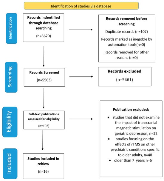 The inclusion criteria were as follows: studies analyzing the effect of transcranial magnetic stimulation (TMS) on geriatric depression over 65 years, studies providing data on patient outcomes following the completion of TMS sessions, studies published in English, and studies published within the last 7 years. Observational studies and interventional clinical studies. The exclusion criteria were the following: studies that did not examine the impact of transcranial magnetic stimulation on geriatric depression, studies focusing on the effects of TMS on other psychiatric conditions specific to older adults, studies published in languages other than English, and studies published more than 7 years ago.