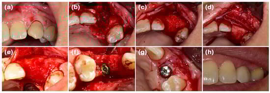 Clinical photographs of case 1. (a) The initial presentation of the maxillary left canine prior to extraction. (b) The buccal bone defect is exposed after full-thickness flap elevation. (c) The defect is filled with deproteinized bovine bone mineral (DBBM). (d) The bone graft area is covered with soft-type resorbable collagen membrane, hard-type resorbable collagen membrane on the buccal side, and finally, collagen matrix in the outer position. (e) Full-thickness flap elevation reveals adequate bone volume. (f) Implants are placed in the sufficiently augmented bone area. (g) The second implant surgery is performed. (h) Definitive prosthesis connection.