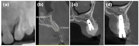 Radiographs of case 1. (a) Periapical radiograph showing external root resorption of maxillary left canine. (b) Cone-beam computed tomography (CBCT) image displaying augmented site after healing. Alveolar ridge width was measured at approximately 5.93 mm, which is sufficient for placement of standard diameter implant. (c) Post-implant placement with guided bone regeneration, demonstrating bone material surrounding implant fixture. (d) Following second implant surgery, contour of bone graft was well maintained.