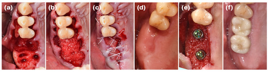First, full-mouth scaling was performed. After the extraction of #16 and #17, a full-thickness flap was elevated, revealing buccal and palatal bone loss at the #16 site (Figure 3a and Figure 4a). Xenograft mixed with collagen (Bio-Oss collagen® (deproteinized bovine bone mineral with collagen), Geistlich Parma AG, Wolhusen, Switzerland) was applied to the extraction sites of #16 and #17, and a resorbable collagen membrane (Bio-Gide compressed®, Geistlich Parma AG) was placed over the graft (Figure 3b). The incision was extended due to the posterior flap design, which increased flap elevation, and there was significant alveolar bone loss and soft tissue deficiency at the #16 extraction site. Even with secondary healing, it was anticipated that the newly regenerated soft tissue would be thin and insufficient. Therefore, along with ARP, a xenogenic collagen matrix (Mucograft®, Geistlich Parma AG) was applied. Hidden-X sutures [15] and simple interrupted tension-free sutures were placed using 4-0 Biotex (Purgo Biologics, Seongnam, Republic of Korea), and secondary healing was intended (Figure 3c). Upon suture removal 10 days later, secondary healing was confirmed, and the patient was monitored. Ten months later, a full-thickness flap was elevated for implant placement, and an augmented alveolar bone width of 8 mm was observed (Figure 3d and Figure 4b,c). The implant was placed in the ideal position (Superline Φ5.0 × 10 mm, Dentium), and GBR (Bio-Oss® and Bio-Gide compressed®, Geistlich Parma AG) was performed to compensate for the graft material lost during drilling (Figure 3e and Figure 4d,e). Five months after the first implant surgery, the second implant surgery was performed, and the final prosthesis—consisting of a customized titanium abutment and zirconia crown with screw-type connection—was placed seven months after the first implant surgery (Figure 3f). Clinical examination revealed stable horizontally and vertically augmented alveolar bone and 6 mm of keratinized mucosa around the implant on the buccal side.