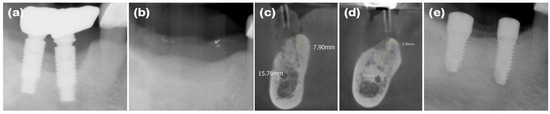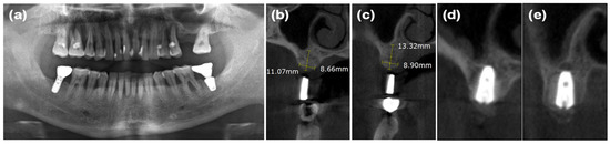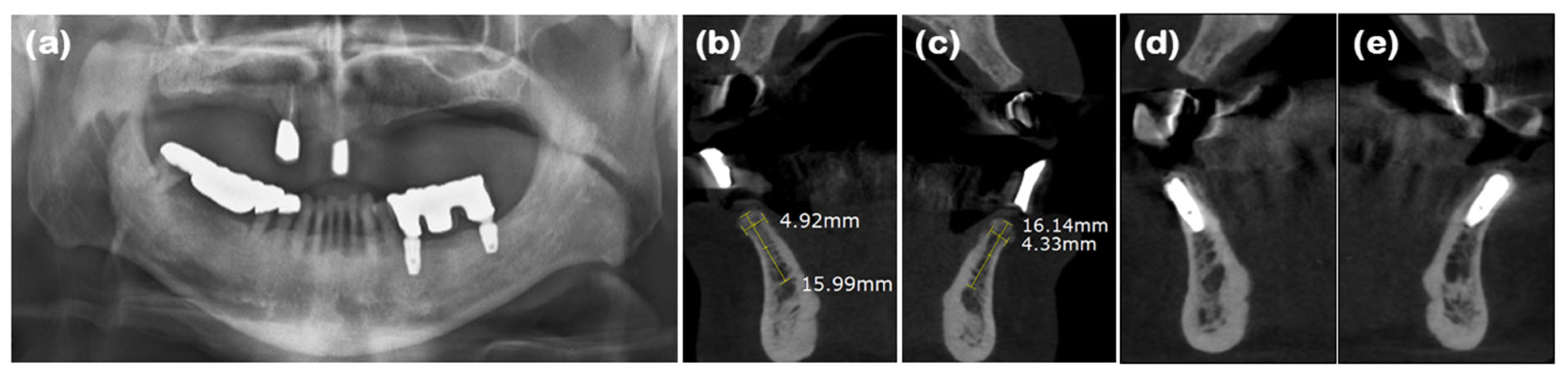 Radiographs of case 3. (a) The pre-operative panoramic view taken during the initial visit. (b,c) CBCT images displaying the augmented site after healing. The alveolar ridge width was measured at approximately 4.92 and 4.33 mm on the mandibular right and left lateral incisor areas, respectively, which is sufficient for the placement of a standard diameter implant. (d,e) The implants were placed in the mandibular right and left lateral incisor areas, respectively.