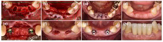 After performing full-mouth scaling, four mandibular anterior teeth were extracted gently. To preserve the interdental papilla after extraction, an incision was made on the lingual side, and the interdental papilla without cutting was included in the full-thickness flap, which was elevated buccally. Buccal bone plate loss was observed (Figure 5a and Figure 6a). Synthetic bone graft material mixed with collagen (Osteon 3 collagen®, Genoss Co., Ltd.) was applied to the extraction site (Figure 5b), and a resorbable collagen membrane (Collagen membrane P®, Genoss Co., Ltd.) was placed over the bone graft. To promote soft tissue regeneration through secondary healing, a xenogenic collagen matrix (Collagen graft®, Genoss Co., Ltd.) was placed over the resorbable collagen membrane and tension-free sutures were applied (Figure 5c). During the healing process, the shape and form of the alveolar bone and interdental papilla, as well as their harmony with the adjacent teeth, were maintained (Figure 5d and Figure 6b,c). Three months after the ARP, the first implant surgery was performed in the #32 and #42 regions (Implantium Φ3.8 × 10 mm, Dentium) (Figure 5e and Figure 6d,e). A horizontal incision was made slightly on the lingual side, and a full-thickness flap was elevated, revealing 4 mm of augmented bone width. The implant was placed in the ideal position. Every two to three months after the first implant surgery, the preserved shape of the interdental papilla was continuously observed. The second implant surgery was performed 3 months after the first implant surgery, and the final prosthesis consist of a customized titanium abutment and zirconia bridge with cementation-type connection were placed 4.5 months after the first implant surgery (Figure 5f–h). Ultimately, the interdental papilla harmonized with the adjacent teeth, and 4 mm of buccal keratinized mucosa was stably observed.